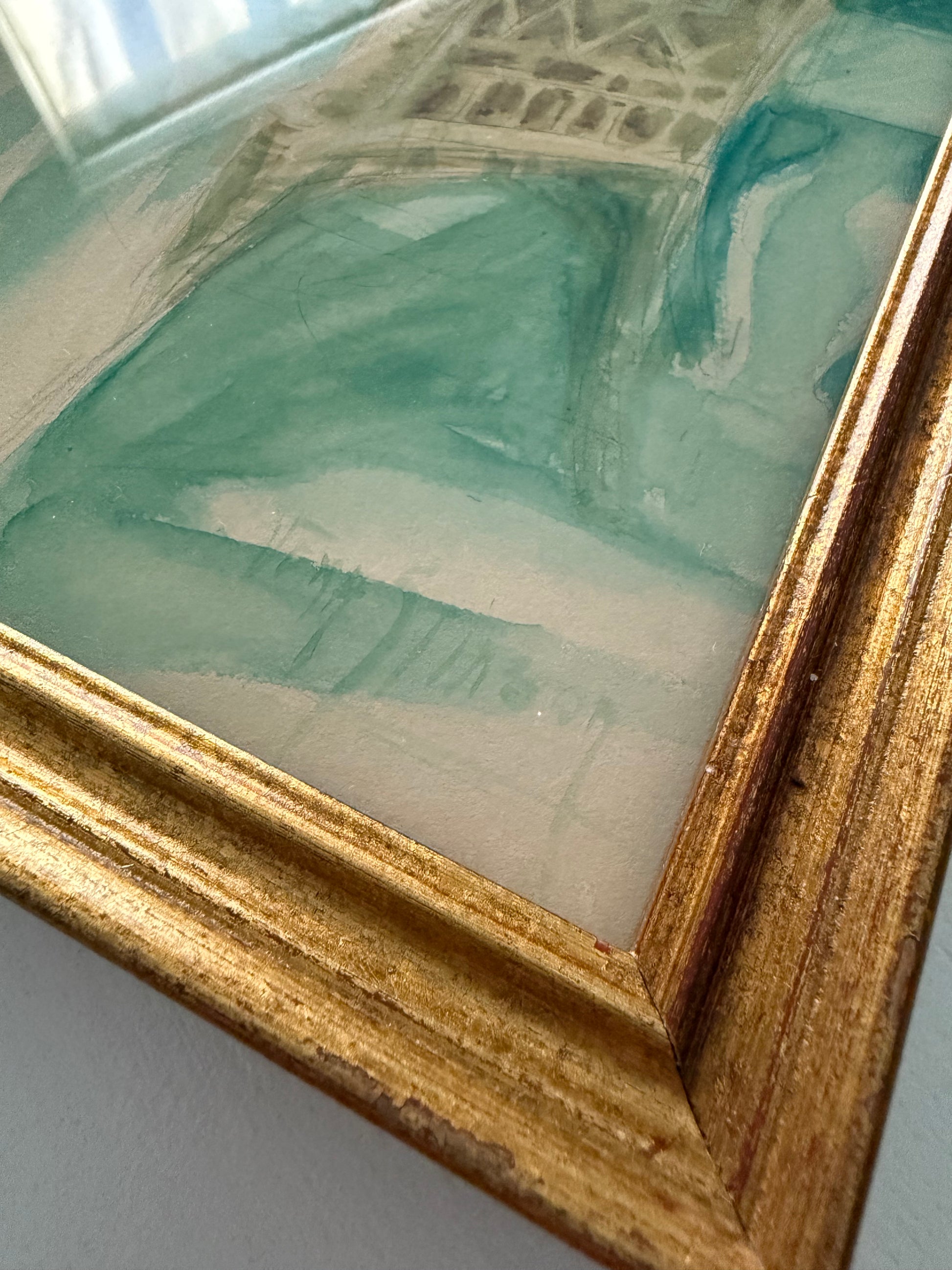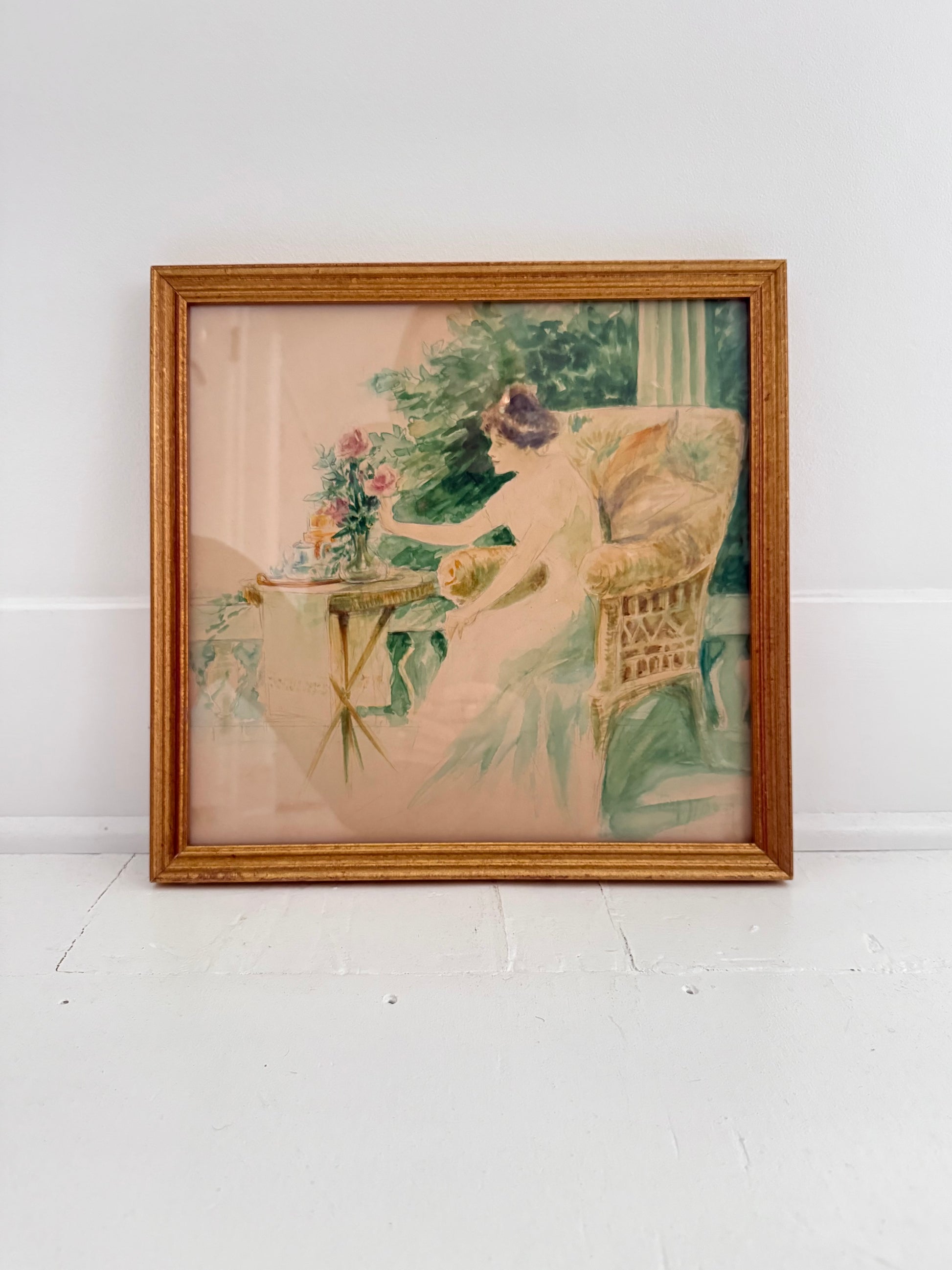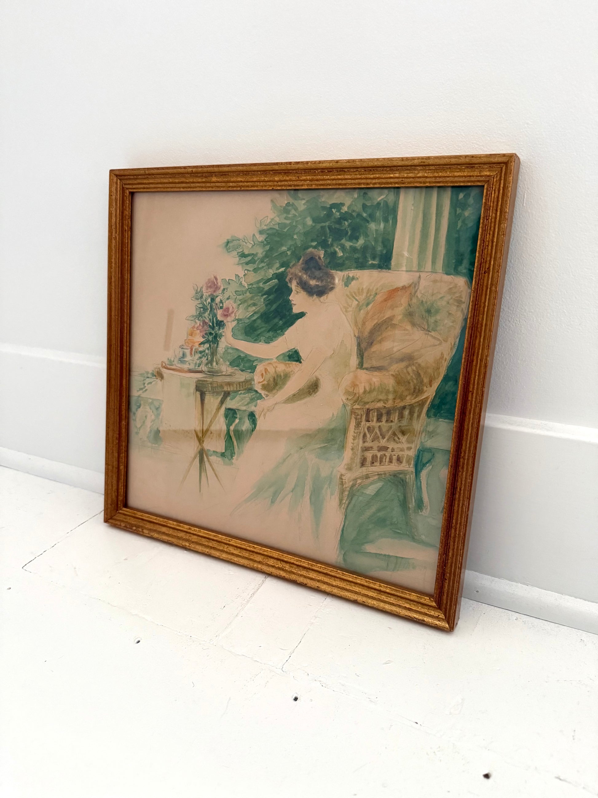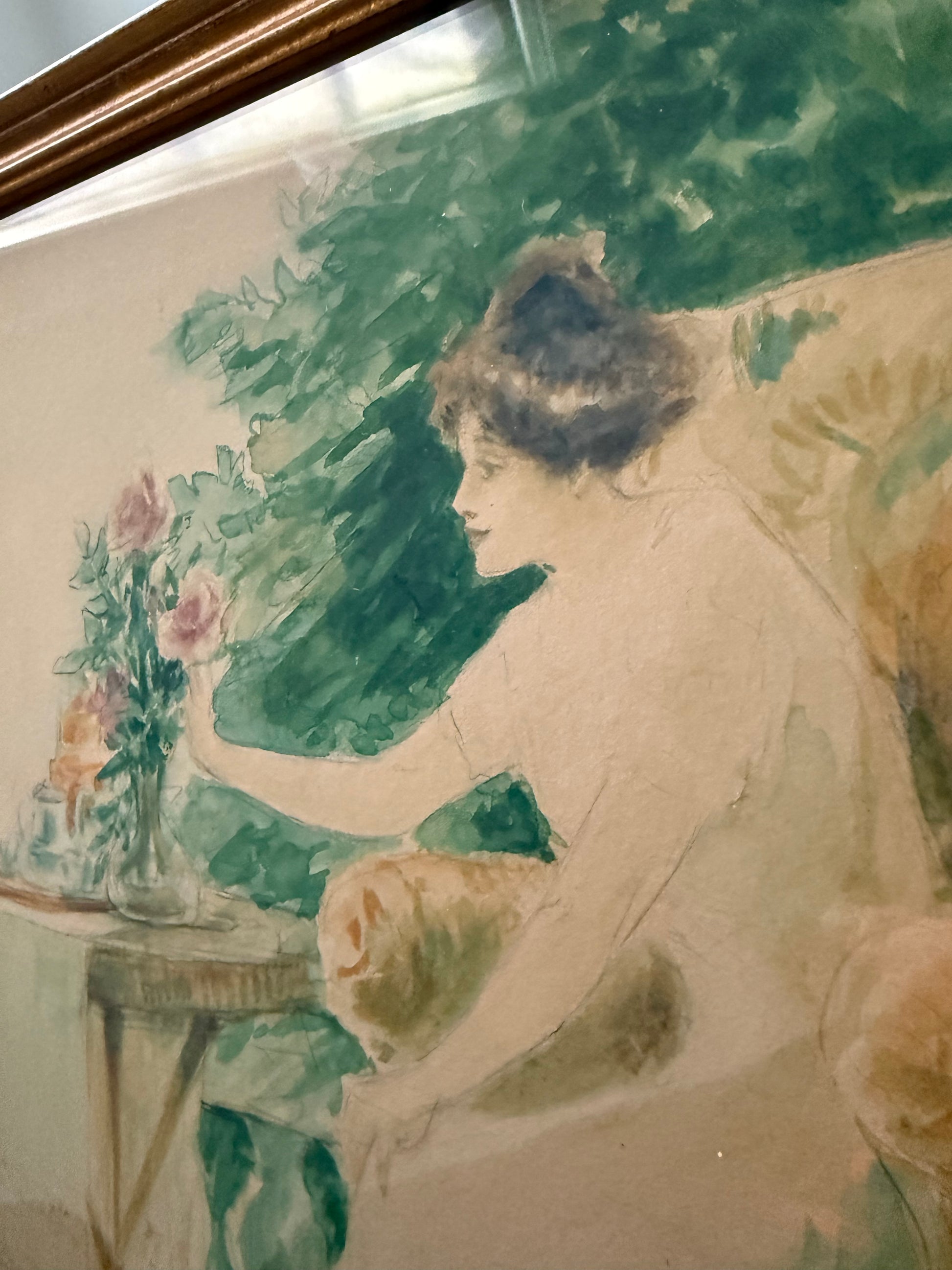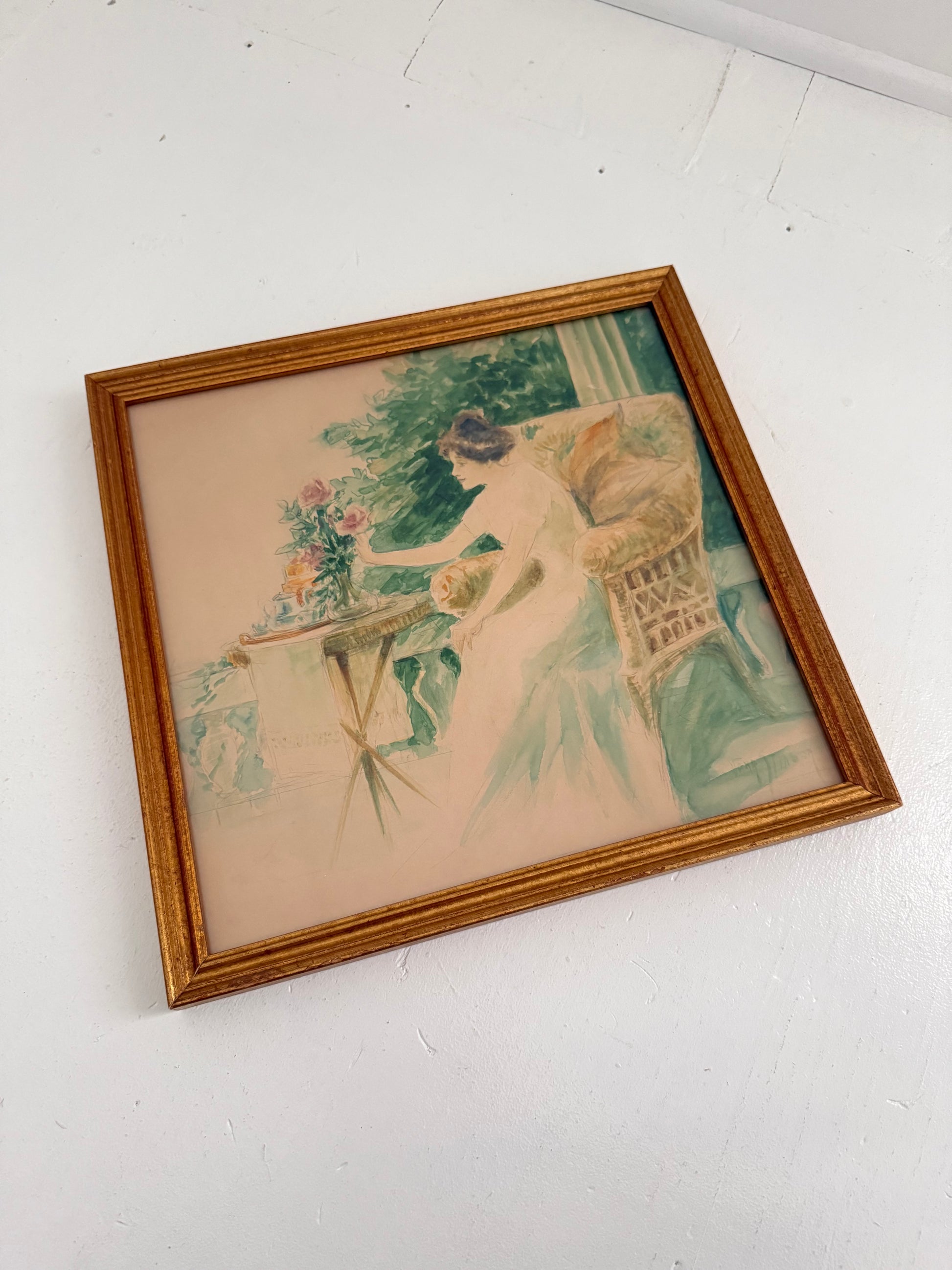 Early 20th century watercolor on toned paper, signed Stinson. Reflects the refined sensibility of American illustration during this time. Retains its original artist-supply backing from the era.