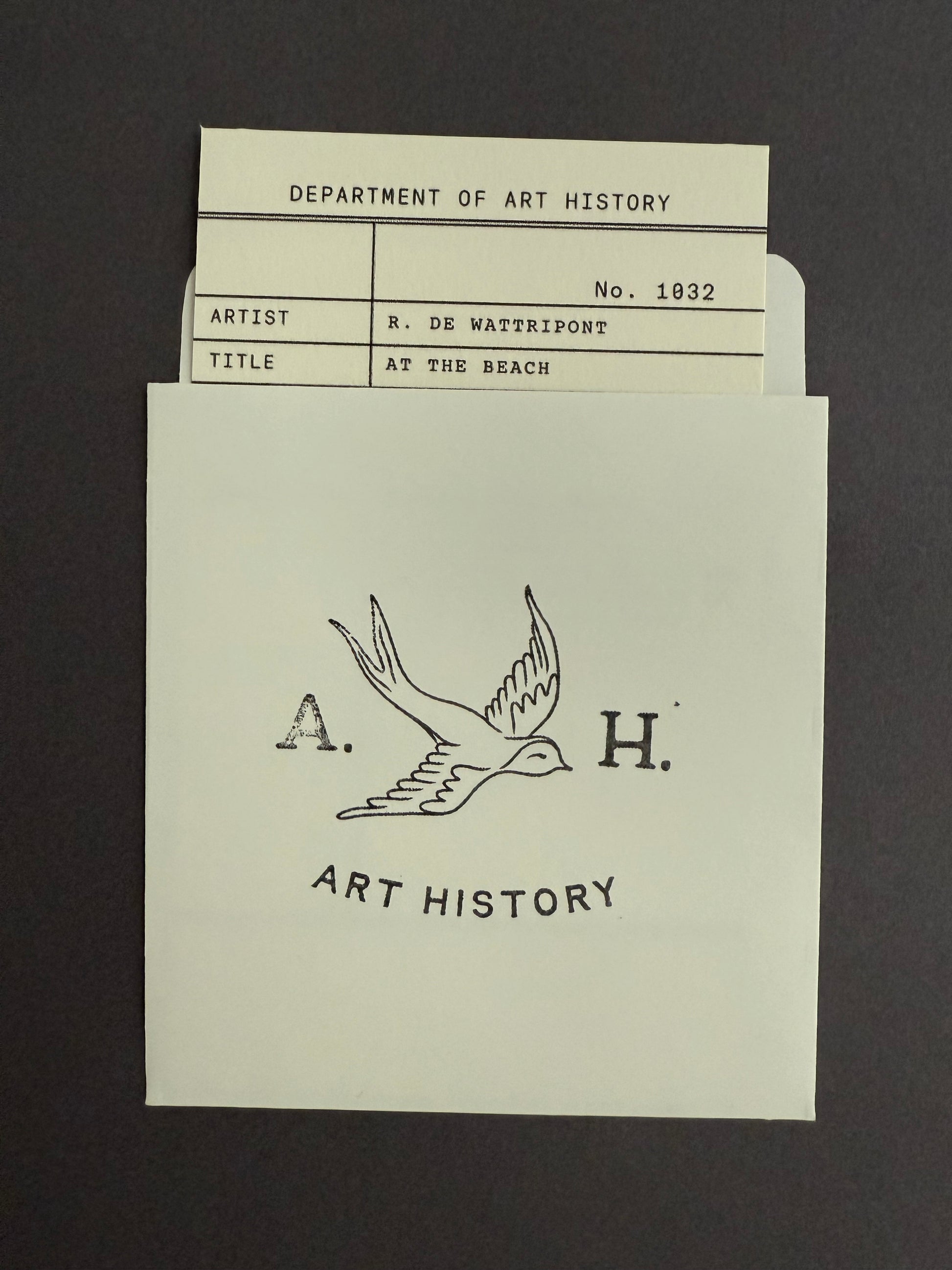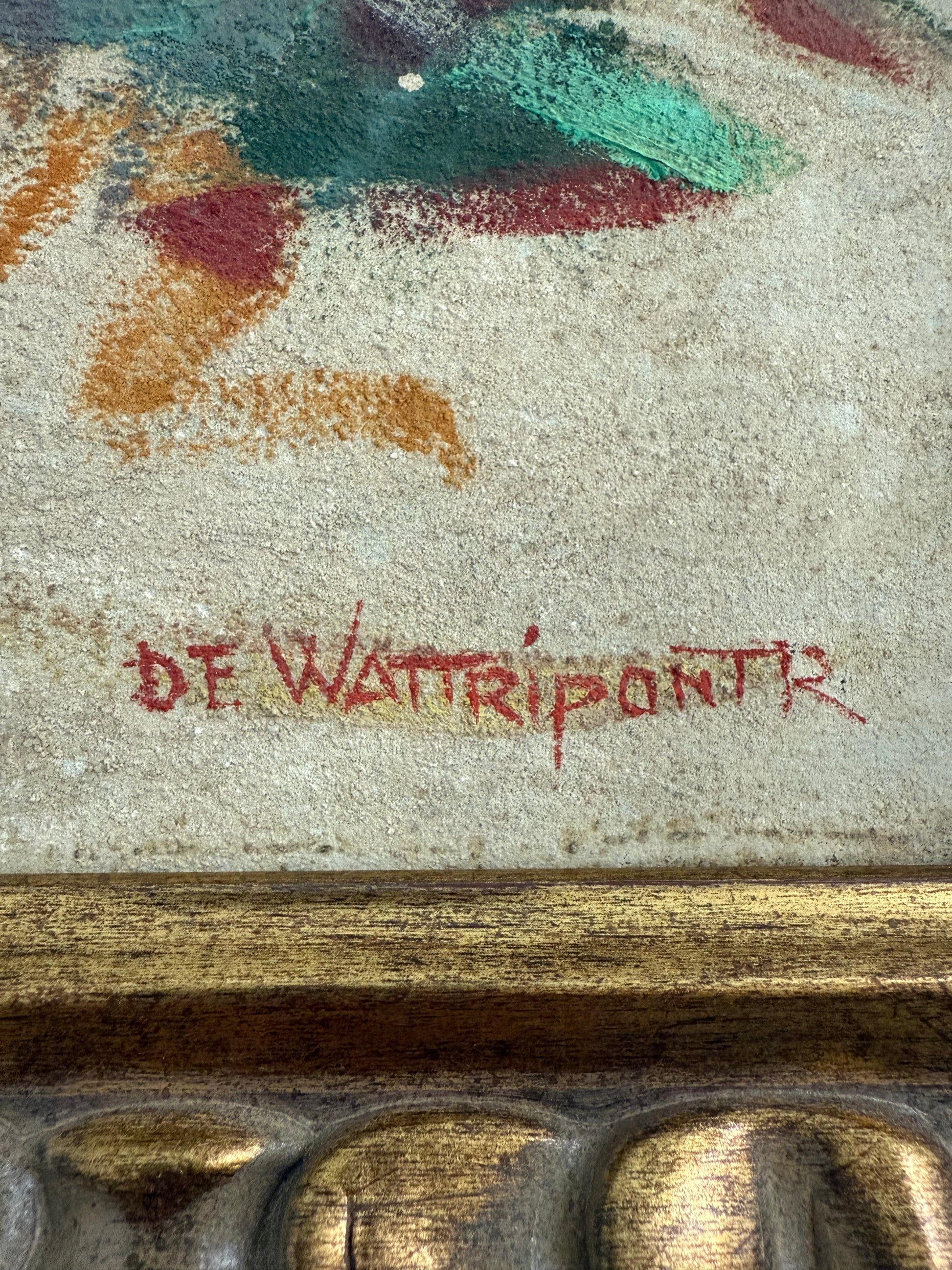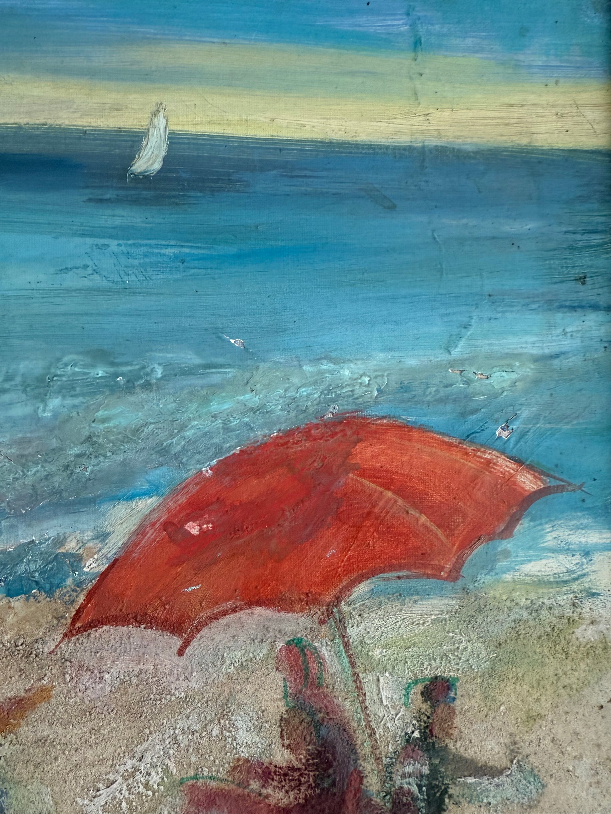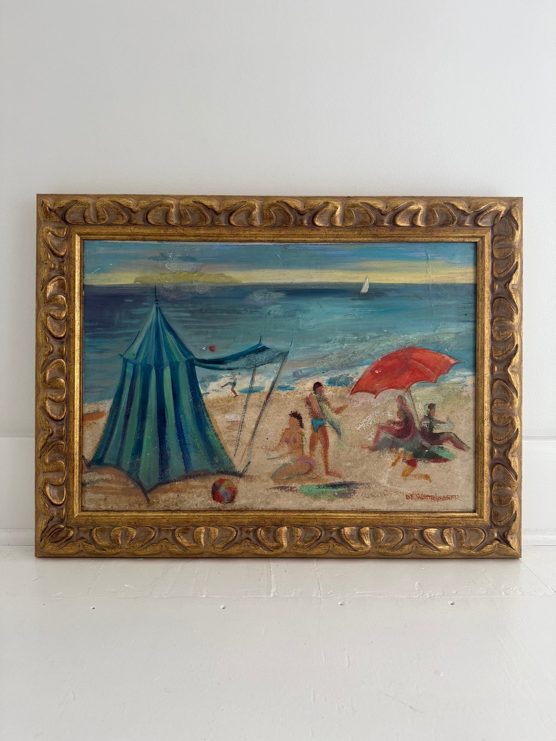 French post-impressionistic oil on canvas signed R. De Wattripont. Circa 1940-1960. Bold colors and painterly brush strokes in a playful coastal beach scene.
