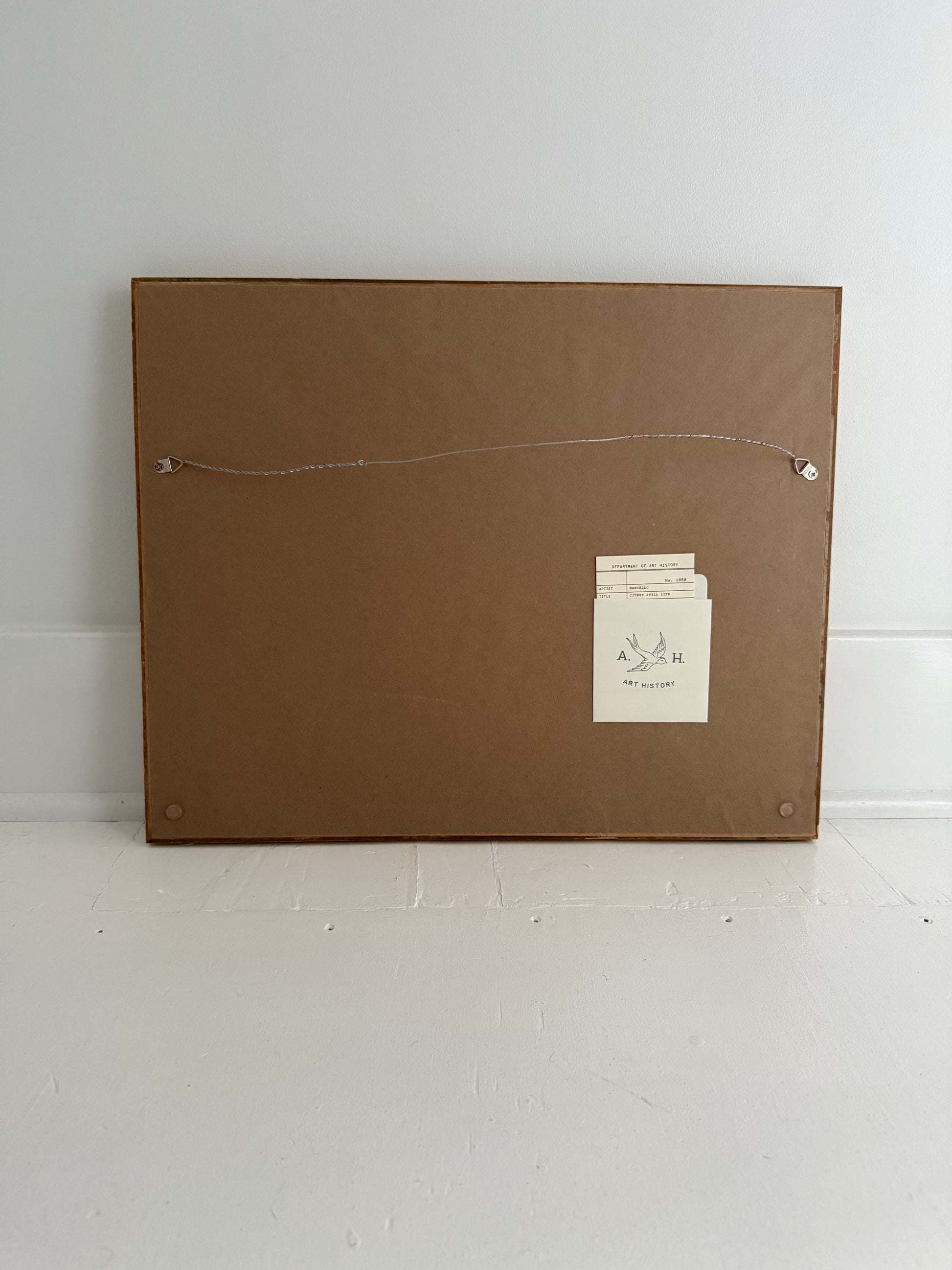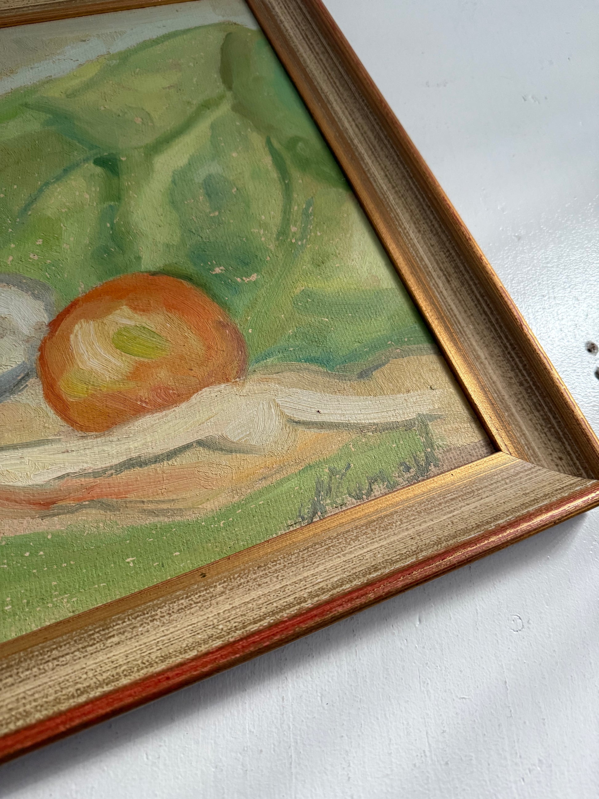 1975 Italian impressionistic still life with signature. The back of the piece has extensive script writing in red, much of it illegible and in Italian. It lists the artist’s name (Marcello) along with a last name (illegible). Other identifiable words include “Roma” and “morti.”