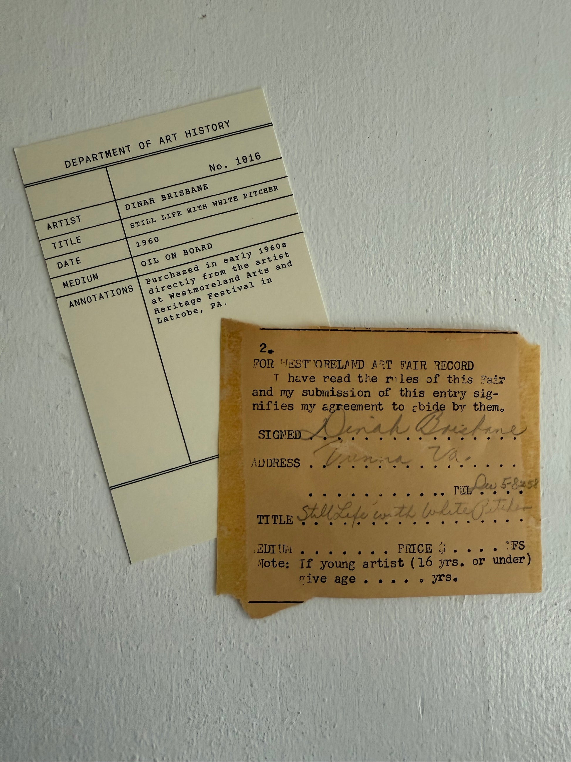 Originally purchased in the early 1960s directly from the artist at the Westmoreland Arts and Heritage Festival in Latrobe, PA.
