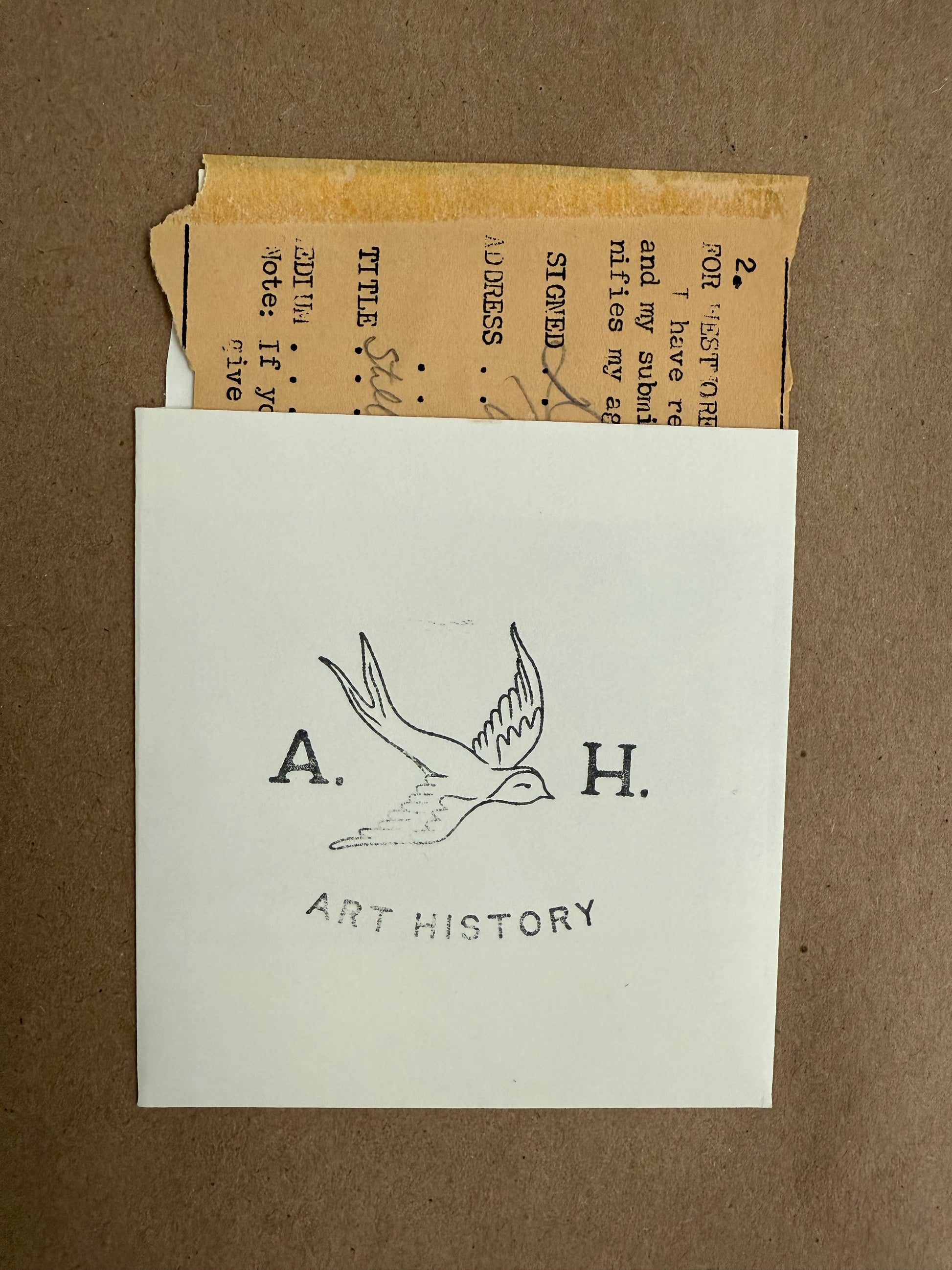 Ephemera from old backing paper (now replaced) is included in A.H. info folder on back of piece (see photo).