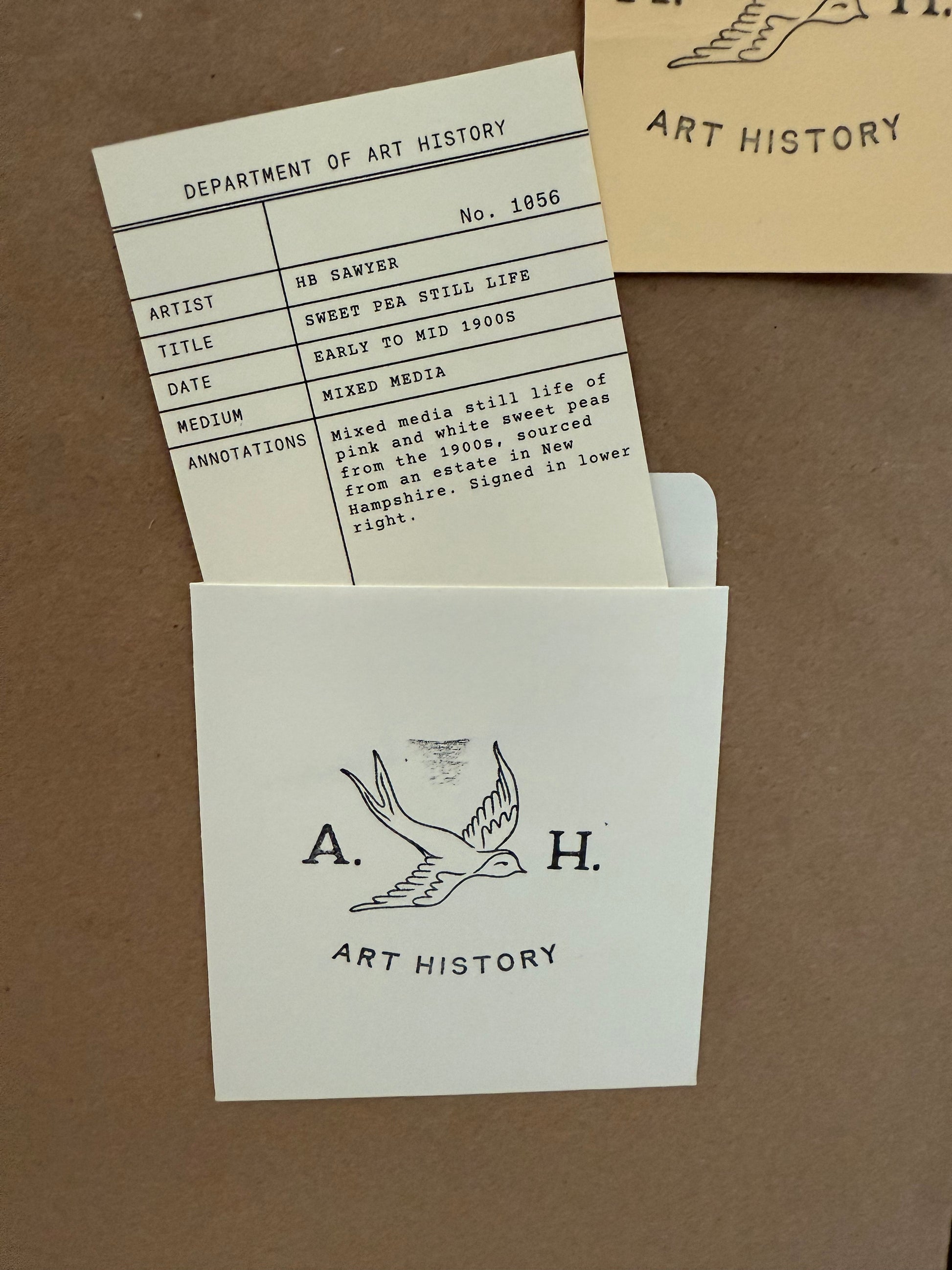 Mixed media still life of pink and white sweet peas from the early to mid 1900s, sourced from an estate in New Hampshire. Signed in lower right by HB Sawyer.