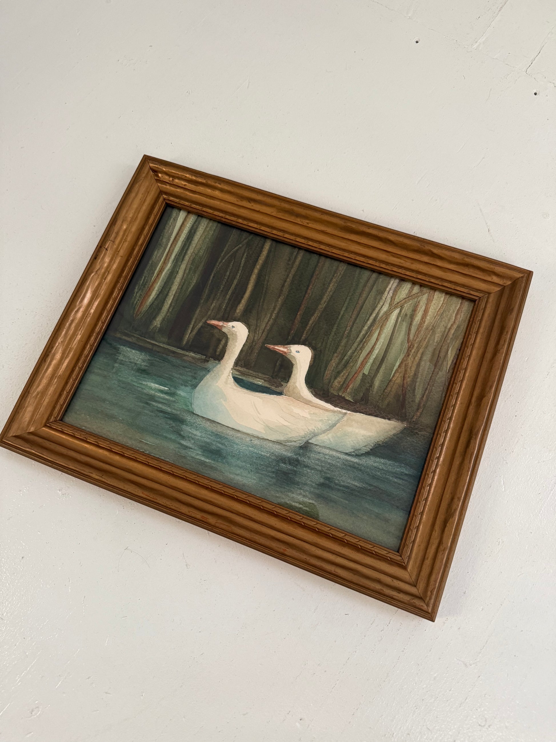 Mid century watercolor featuring two white ducks, painted by Barbara Schoening and sourced directly from her estate.