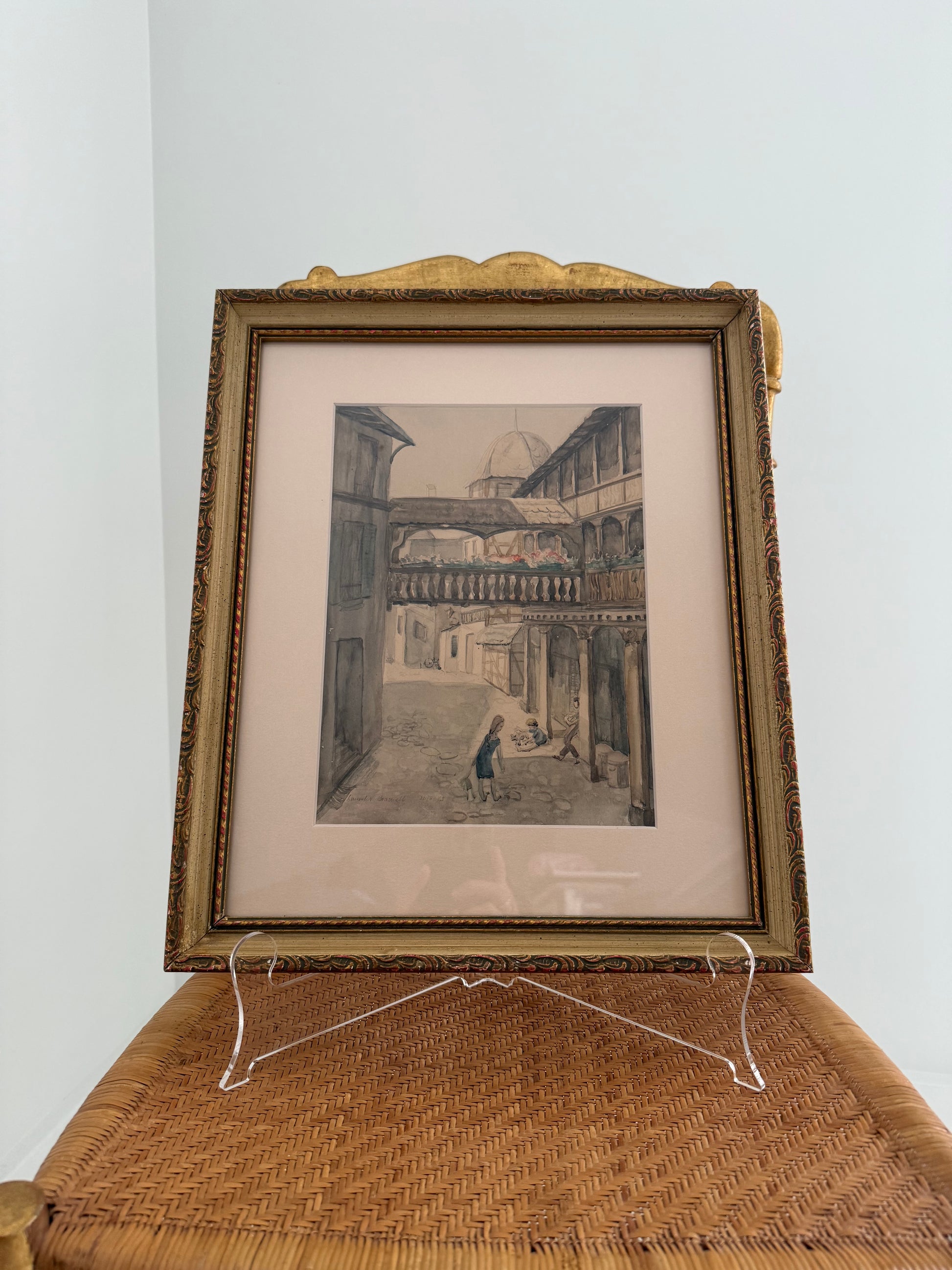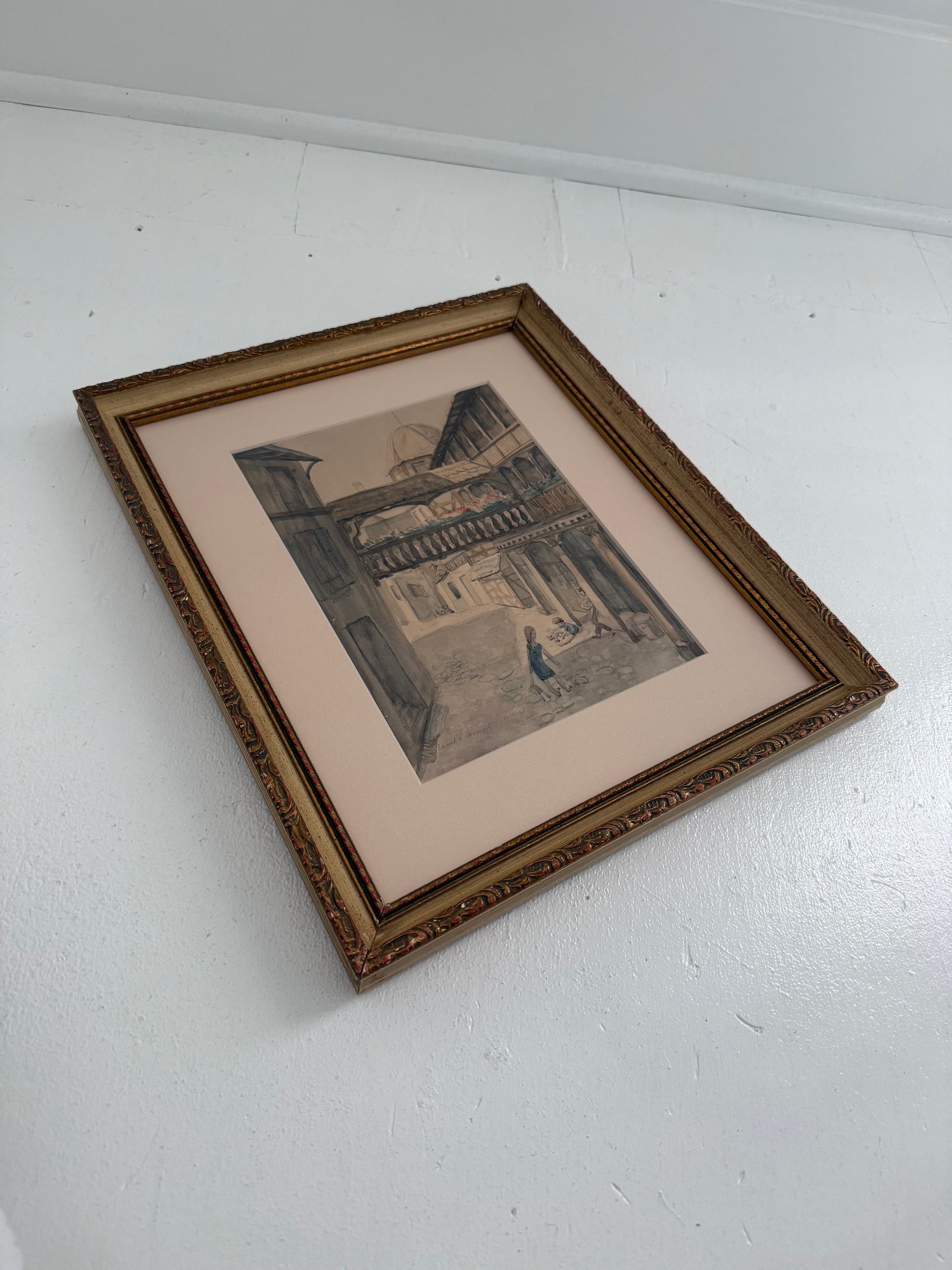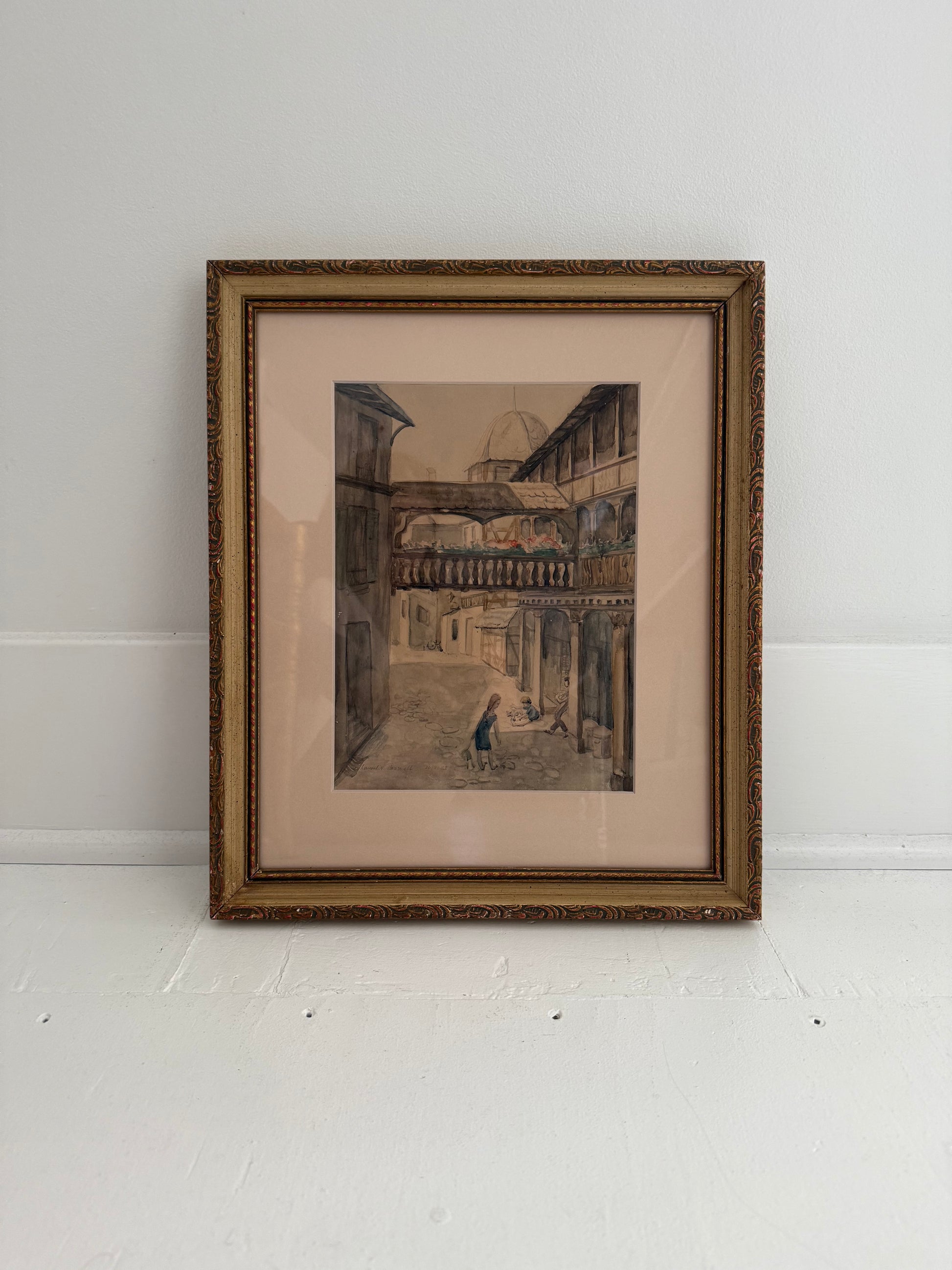 Watercolor village scape of La Place du Corbeau in Strasbourg, France. Signed Laurel N. Braswell, 1953.