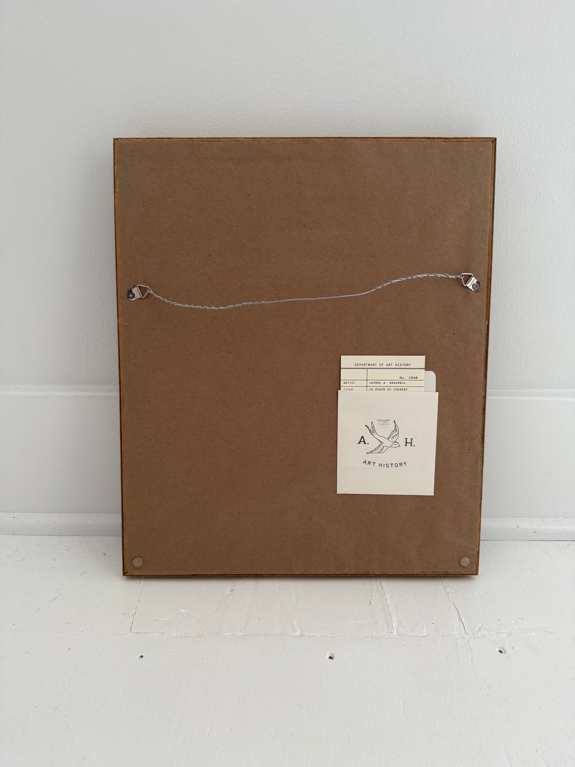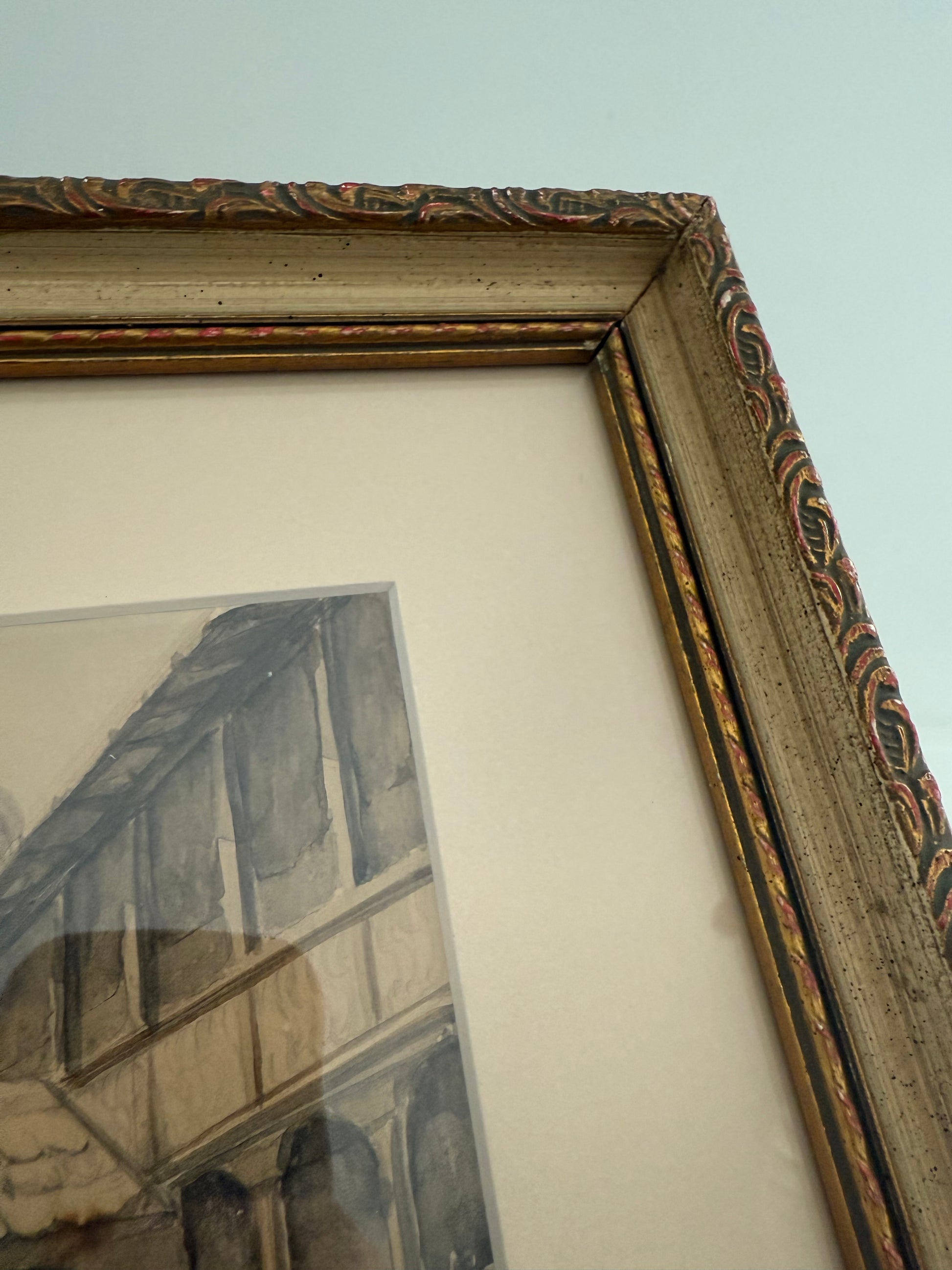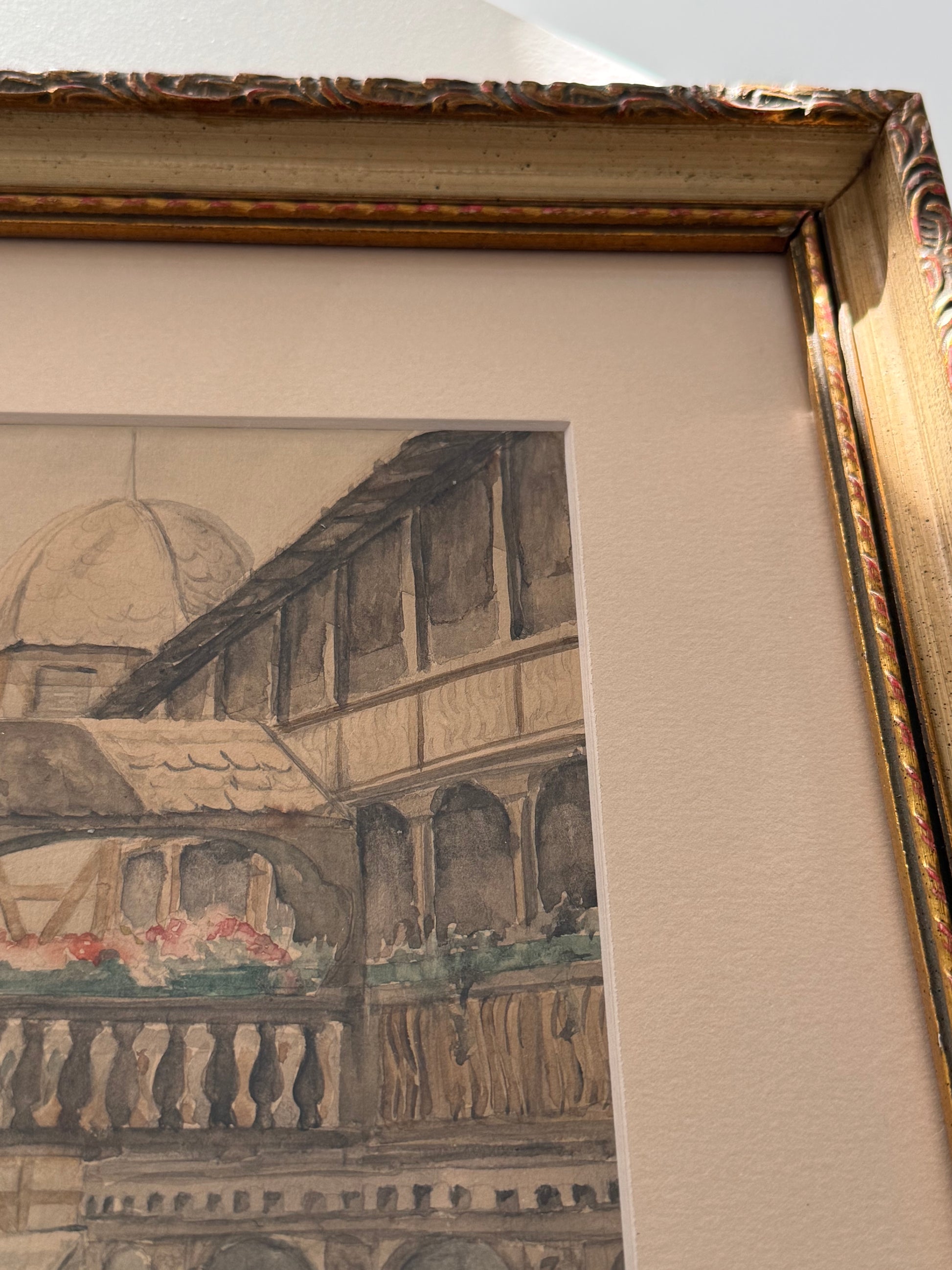 Watercolor village scape of La Place du Corbeau in Strasbourg, France. Signed Laurel N. Braswell, 1953.